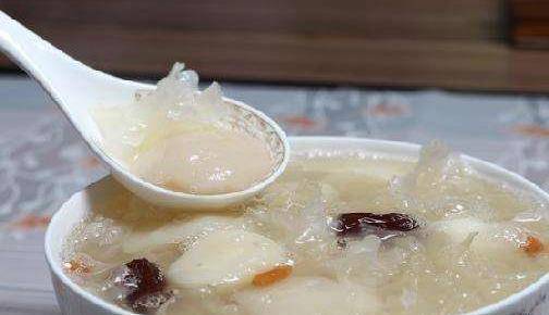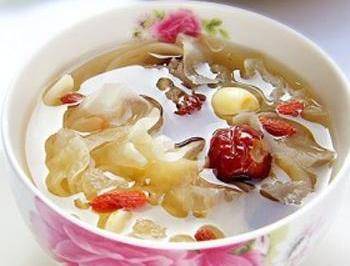 這道湯是雪梨和銀耳一起熬制的湯,這要是利用瞭銀耳配雪梨後有滋陰清肺以及消痰降火的功效。具體的食材是:雪梨1隻、水發銀耳30克、貝母5克、白糖適量。先將銀耳泡開去根,然後去雜洗凈,撕成小片;再將雪梨去皮切塊。將準備好的食材同放在燉皿內上籠蒸30分鐘左右即可,取出即可食用。