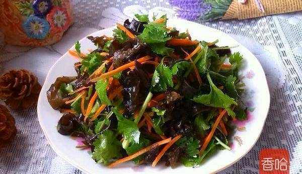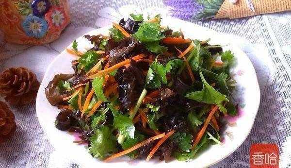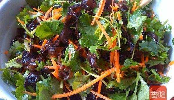 木耳100克、胡蘿卜100克、香菜50克、芥末油適量、香油適量、醬油適量、醋適量、味精適量、鹽適量