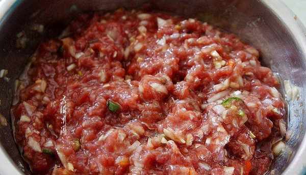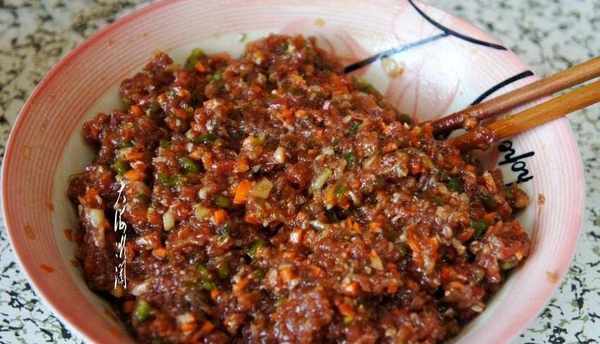 馬肉餡加少許老湯攪拌上勁,再加入蔥末、薑末、辣椒碎、鹽、五香粉、胡椒粉、生抽、料酒、蠔油沿一個方向攪拌上勁,澆上炸熟的豆油攪拌拌勻特別香。