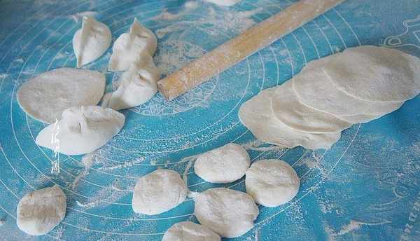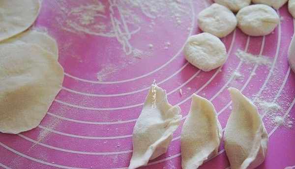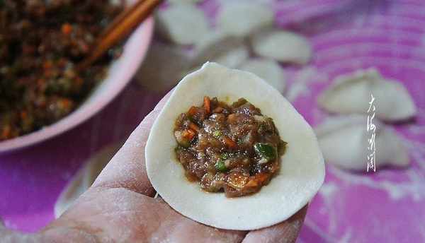 包餃子:面團揉成細長條,揪成均勻的小面劑子,搟成餅,包上餡,兩手對捏就好瞭。