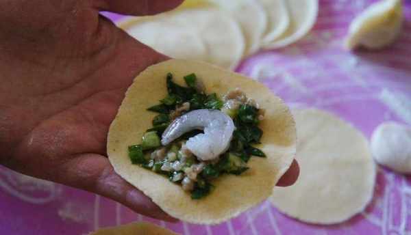 包餃子:面團揉成長條,揪成面劑子,取一個面劑子搟成餃子皮包上餡,每個餃子放入一個蝦仁,捏成餃子。