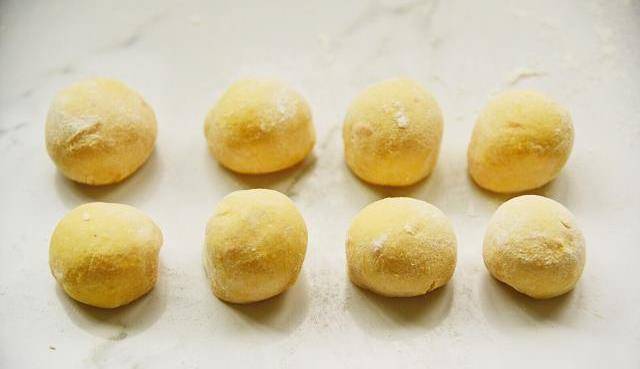 1、先把南瓜洗凈去皮切成塊,在鍋中蒸熟再用勺子搗成泥。南瓜泥微涼時加入面粉、酵母、細砂糖、冷水混合揉均勻,放在溫暖處發酵1小時至兩倍大。