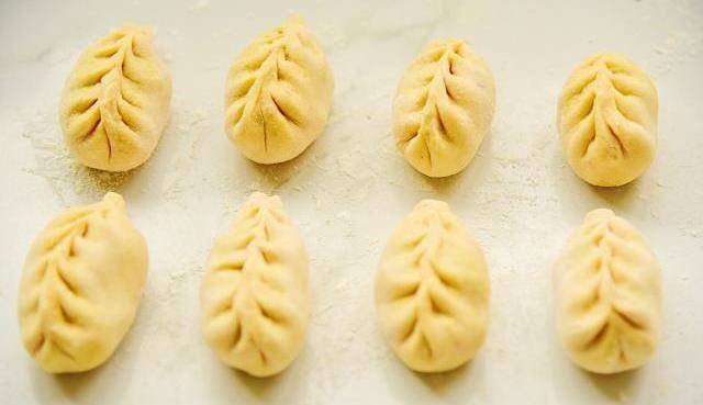 4、另把豆沙餡分割成8份。醒發好的面團包入豆沙餡,做成柳葉形的包子狀。