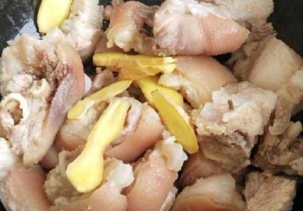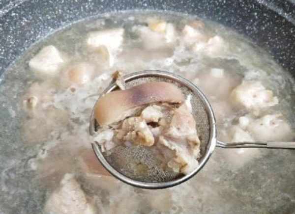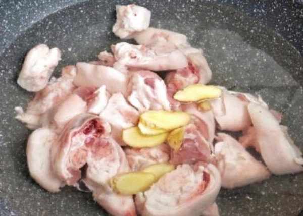 第三步:豬蹄冷水下鍋,開大火將豬蹄焯水,鍋中加入兩勺料酒,三片生薑,焯水時撈出浮沫