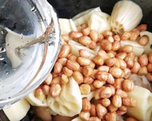 第六步:傢裡都有電飯煲吧,,或者高壓鍋也可以,本人比較喜歡用高壓鍋,將焯水後的豬蹄洗凈放入電飯煲中,加入大半鍋開水倒入半熟的花生米,還有洗凈的蓮藕,2~3片生薑,加入兩勺食用鹽