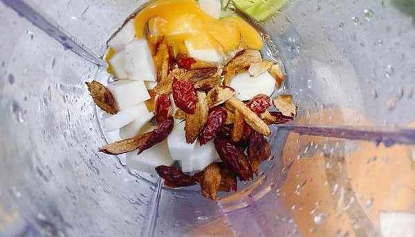 把紅棗和山藥和一個雞蛋放入料理機,打成泥。