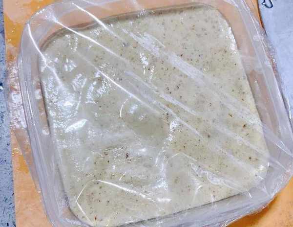 碗底抹油,把打成泥的倒入碗中。蓋上保鮮膜,用牙簽在上面戳幾個洞,冷水上鍋蒸15到20分鐘。