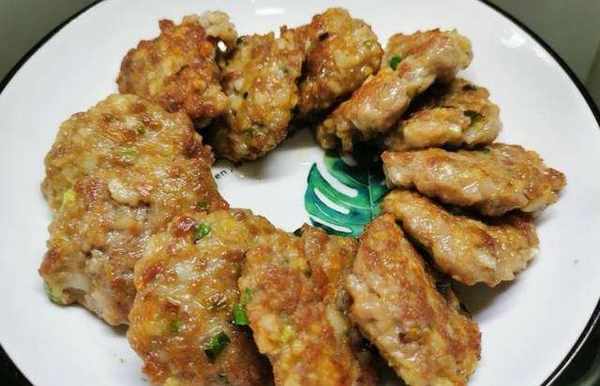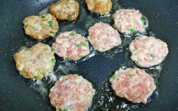 把肉團放入手中來回摔打幾下,壓扁成型,放入鍋中慢煎成型,煎至兩面金黃後即可。