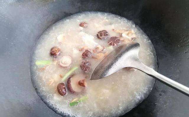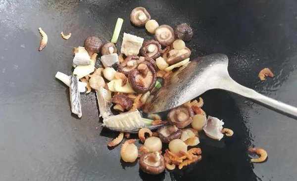 起鍋熱油,放入薑片和蔥白爆香,在放入魚幹瑤柱香菇蝦米翻炒爆香。