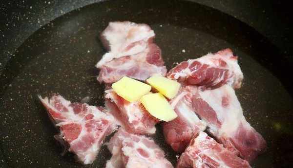 2、冷水下鍋,放入排骨,加入薑片、1大勺料酒,大火煮開,撈出浮沫,再撈出排骨沖洗幹凈備用