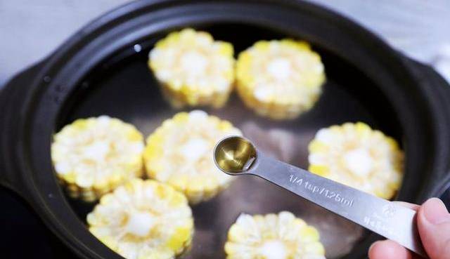3、將排骨和玉米放入砂鍋中,加入水和1小勺米醋,大火煮開,蓋上蓋子,轉小火慢燉40分鐘