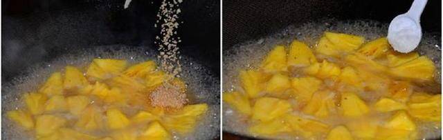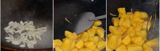 接下來,要有另一個爐和鍋才行。先一點油爆香洋蔥,入炒鳳梨至熱則加水到淹過鳳梨。