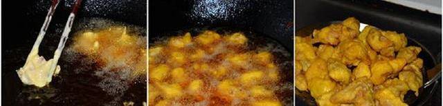 然後,待油溫拉高些,則再度入鍋,搶酥後再撈起瀝油備用。