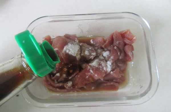 2.鴨脯肉切成片加入鹽、料酒、生抽和淀粉等調味料拌均後,醃制一下;