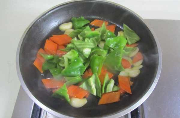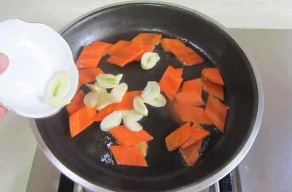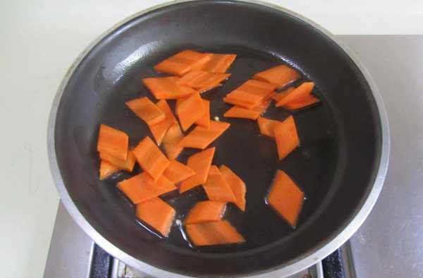 5.鍋中留少許油,下入胡蘿卜片煸炒;