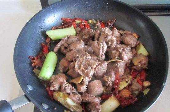 然後我們就可以在鍋裡面倒入多一些的食用油,等油熱過後就可以放入蔥段,花椒,香葉,肉蔻,八角,薑片,然後就等炸這些食材炸出香味來,看著炸到金黃之後就可以撈出來瞭。因為炸過調味品的油會更加的香,就可以倒入兔肉瞭,用中火滑炒一下,等到炒到油色透亮的時候,就可以裝盤備用一下。
