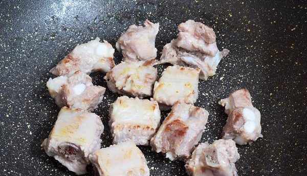 3、鍋中倒入少許食用油燒熱,放入排骨煎至微焦