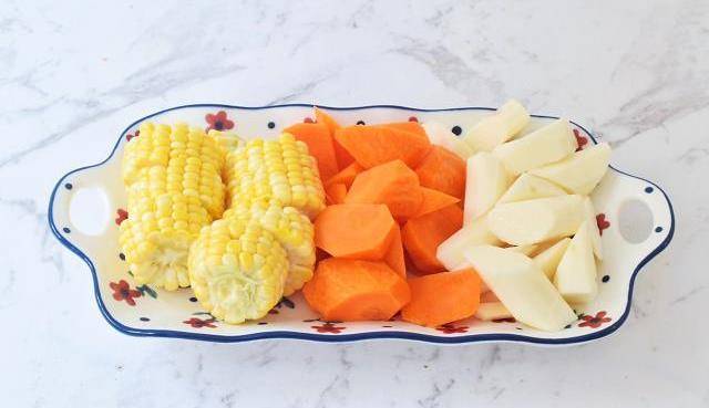 2、,山藥去皮滾刀切塊,玉米切小塊,胡蘿卜去皮滾刀切塊