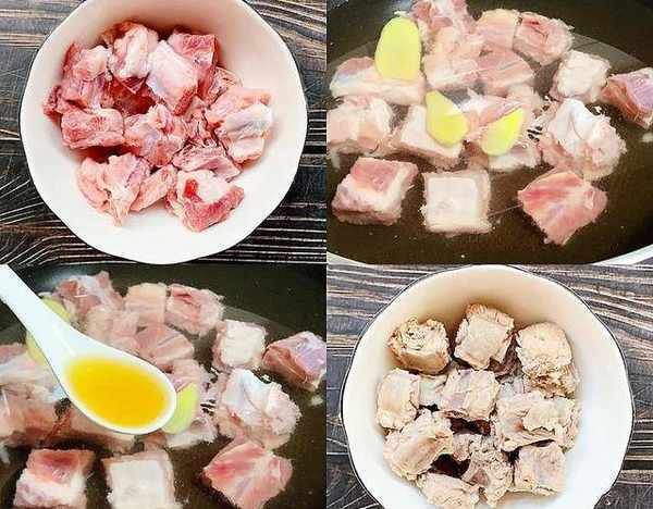 2、排骨切成小塊,冷水下鍋,加入薑片和一勺料酒,煮沸去除血水,撈出用冷水洗凈瀝幹。