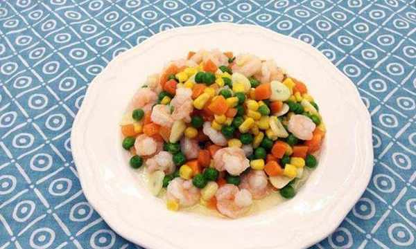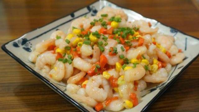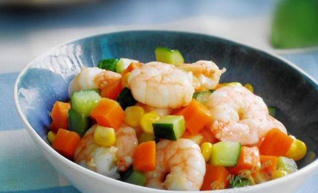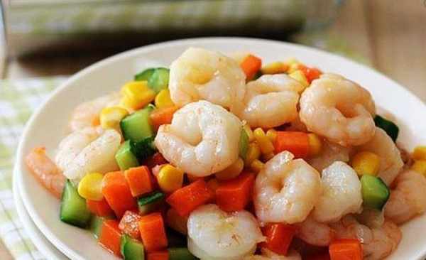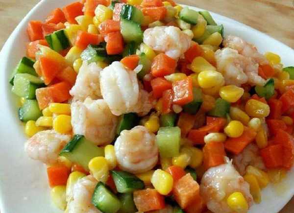 這時候鍋中加入1大勺油,蝦仁變色後即可撈出。另起鍋加入少許油,將胡蘿卜和黃瓜丁下鍋炒至斷生,加入少許鹽,加入玉米粒翻炒。