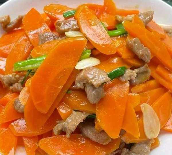 3.鍋中留底油,再次燒熱後,下蒜末爆香,然後倒入胡蘿卜片翻炒,加入適量食鹽調味,翻炒至斷生,倒入肉片和蔥段,繼續翻炒一分鐘即可出鍋,營養好吃,養胃又養顏。