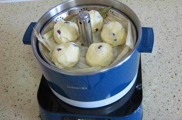 6,電蒸鍋先加清水,然後在籠屜上鋪上玉米葉子,如果沒有可以用屜佈替代瞭。每一個餑餑之間留有空隙,鍋蓋要蓋好。