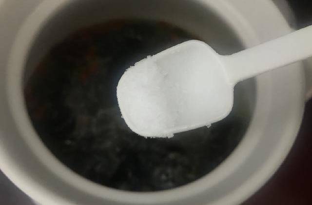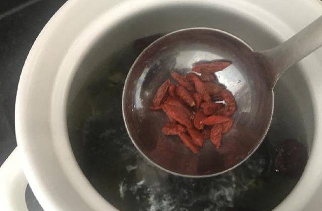 5、最後加入1小把枸杞,適量鹽,攪拌均勻即可熄火。枸杞容易煮爛,最後加入稍微煮一下即可。廣東人煲湯都不喜歡加味精調味瞭,因為湯本身已經很鮮美瞭,隻需適量鹽提味,多加其他的調味料反而會影響味道。