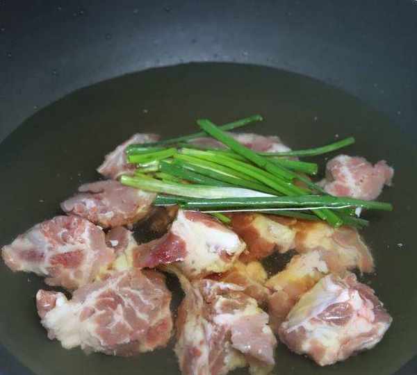 第1步、新鮮的排骨沖洗幹凈,放入鍋中,加入適量的清水沒過排骨,然後倒入一勺料酒,兩根小蔥,大火燒開給排骨焯水,去除排骨的腥味和裡面的血水。