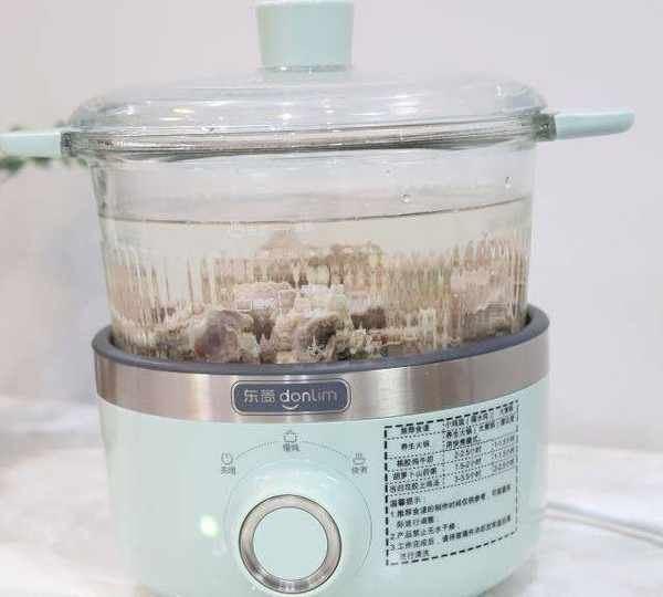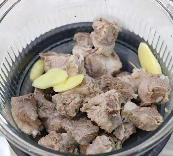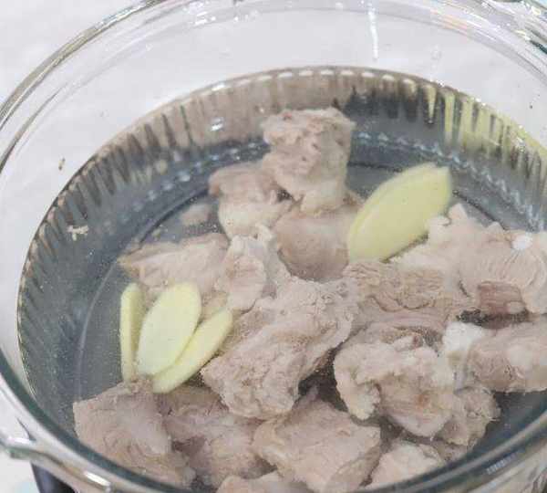 第2步、煮開後的排骨用清水沖洗幹凈血沫,撈出來放進玻璃鍋內,加入幾片幹凈的生薑。