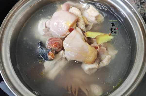 2、準備好以上食材之後,我們就可以開始準備將雞肉焯水瞭。取出一個大小合適的幹凈的鍋,隨後往鍋內倒入適量的飲用水之後,開大火候燒煮鍋內的水,直至將水煮沸以後就可以把我們準備好的雞肉放到鍋內開始焯水,再加入幾片生薑去腥,焯出雞肉內多餘的血水和雜質之後就可以瞭。