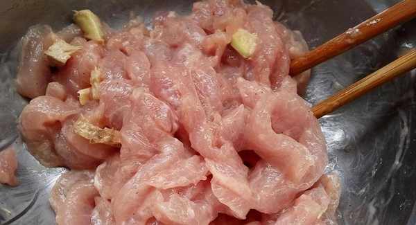 步驟1、裡脊切成薄片,打上半個蛋清,放少許的食用鹽,胡椒粉,玉米淀粉,充分地抓拌均勻,讓肉片的表面,形成一層薄薄的淀粉,這樣肉片才會滑嫩,口感不柴,