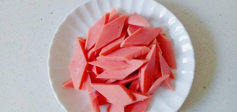 口蘑掰掉老根,切成硬幣厚的薄片,買點火腿腸,同樣切成菱形片,接著鍋裡少來點油,把口蘑下鍋,開中小火兩面各煎二分鐘,
