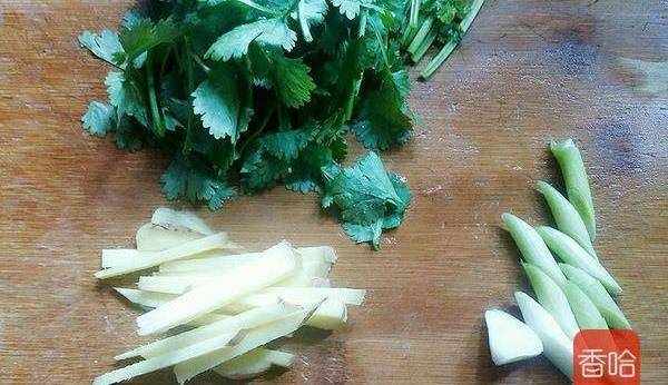 3.薑切絲,蒜苗切段,香菜切寸段,