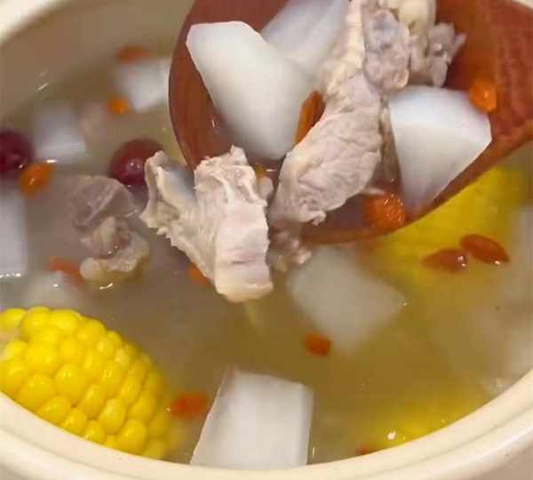 排骨焯水,加入切塊的玉米,去皮切塊的白蘿卜,幾顆紅棗,加入適量清水燉煮50分鐘,煮開後加枸杞還有適量的鹽,攪拌均勻即可。