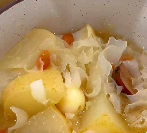 提前泡好的銀耳,切塊的雪梨,紅棗幾顆,還有百合,去芯的蓮子,然後加入適量的清水熬煮40分鐘,煮開後再加冰糖,枸杞,再煮八分鐘,這樣銀耳雪梨湯就煮好瞭。
