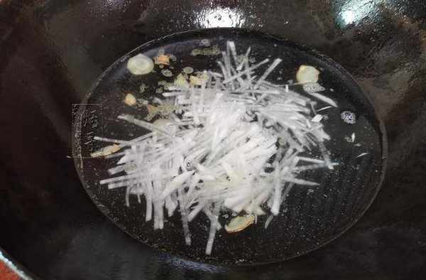 4、加好水後,我們就把之前切好的蘿卜絲放到鍋內一起熬煮。大傢在切蘿卜絲的時候最好是將蘿卜絲切的越細越好,越細的蘿卜絲口感會更好,不過要是有的小夥伴就是喜歡吃粗一些就按照自己的喜好來決定即可。