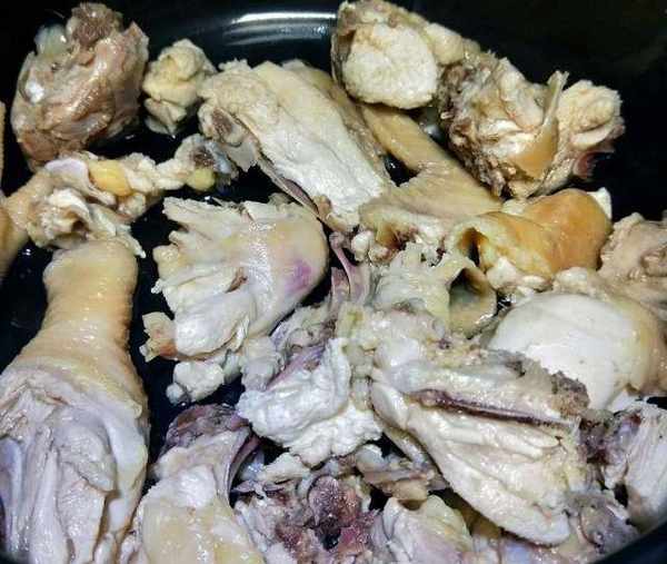 大火燒開後,撇去血沫,然後觀察雞肉情況,在確定沒有浮沫飄出後,撈出雞肉塊,冷水清洗幾次,然後擺在砂鍋底部。