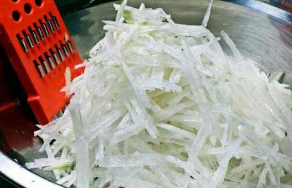 1、首先我們從市場上購買一個新鮮的蘿卜,然後回傢之後先在清水當中清洗幹凈,然後用擦皮工具將蘿卜擦成絲放在盤子當中。