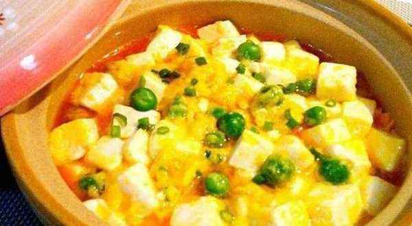 食材:嫩豆腐一塊約300-400克 咸蛋黃3顆 新鮮豌豆一小把 蔥薑末少許 胡椒粉少許 水淀粉適量