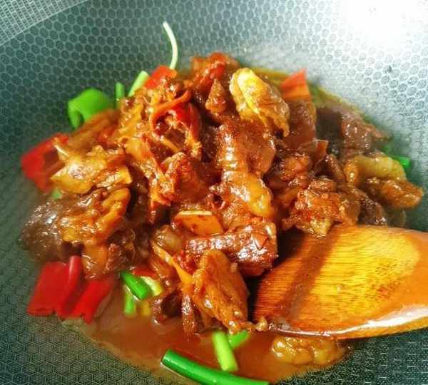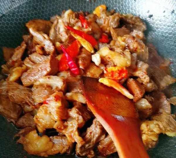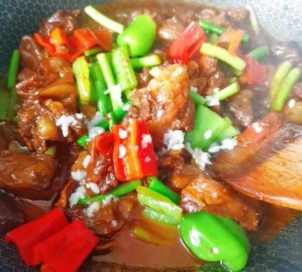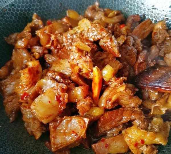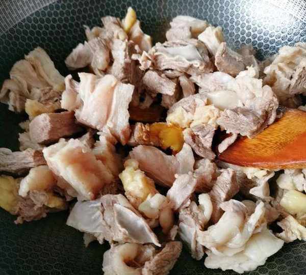 第13步、下入之前煮好的牛腩,翻炒均勻。