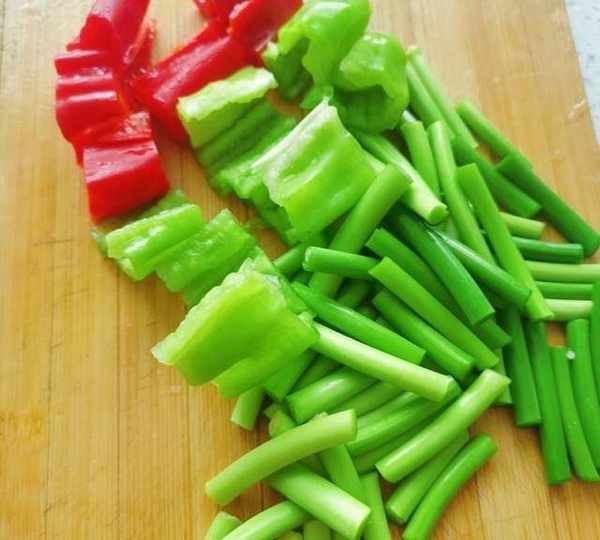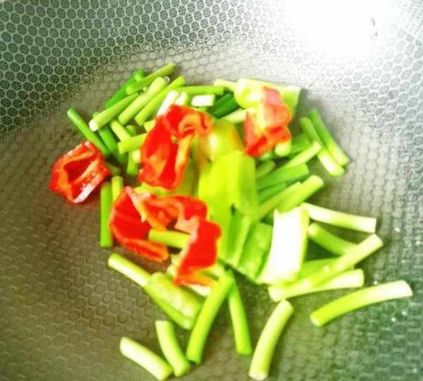 第12步、起鍋燒油,下入辣椒和蒜苔翻炒斷生。