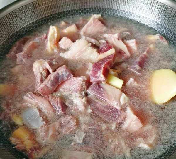 第3步、起鍋燒水,下入牛腩焯水,加薑片和料酒。
