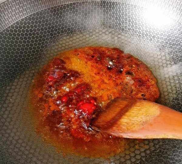 第5步、起鍋燒油(油少許),小火,下入火鍋底料煸出紅油。