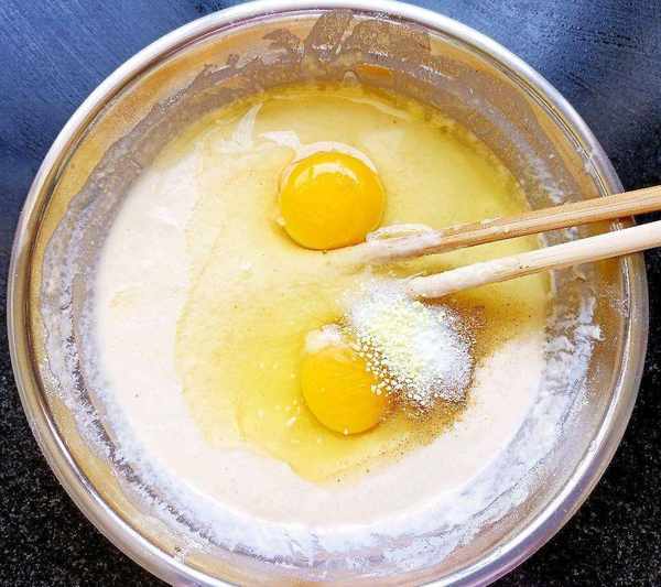 5、在攪好的面糊中放入雞蛋,十三香、鹽、雞精適量攪勻備用。