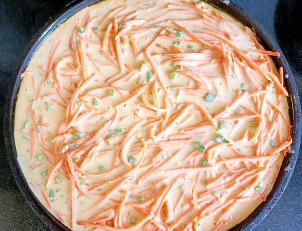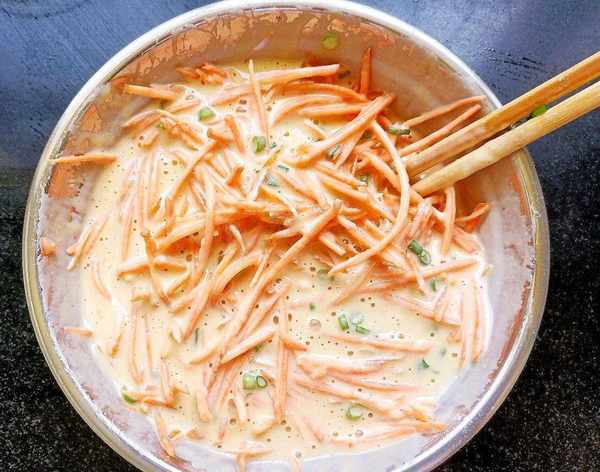 6、紅蘿卜絲和蔥花放入面糊中拌勻備用。