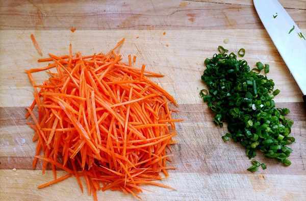 1、紅蘿卜用插菜板插成細絲,小蔥切蔥花備用。