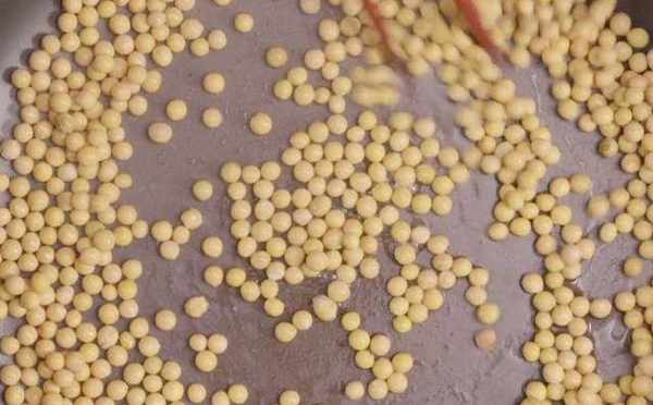 第一步:首先把準備好的黃豆放入清水中,預先浸泡30分鐘;之後撈出適當放幹,然後直接倒入加瞭少許油的平底鍋中,用勺子或者筷子不停翻拌,直至把黃豆炒熟關火。