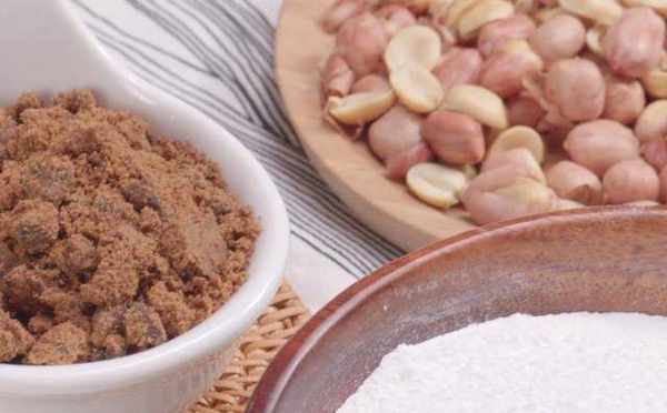 【準備原料】:糯米粉250g,黃豆120g,熟五香花生米60g,白糖15g,紅糖10g。