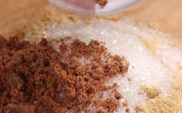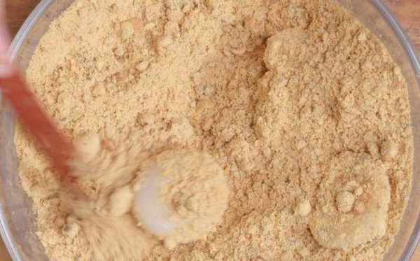 第三步:準備一個小碗,倒入處理好的黃豆末和花生末,在加入和白糖和紅糖均勻攪拌。