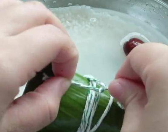 你一定要按壓結實,這樣煮出來的粽子才會圓潤飽滿。右手捏住粽子,兩邊把米裹住,然後用上面的粽葉蓋住米,這樣給它裹起來,然後把粽葉再給他折過去,這樣就行瞭。這個繩子是我專門買來捆粽子的,繩子粗點會比較容易打結,專門捆粽子用的那種草我沒有買到,這樣就行瞭,一個四角粽子就包好瞭。